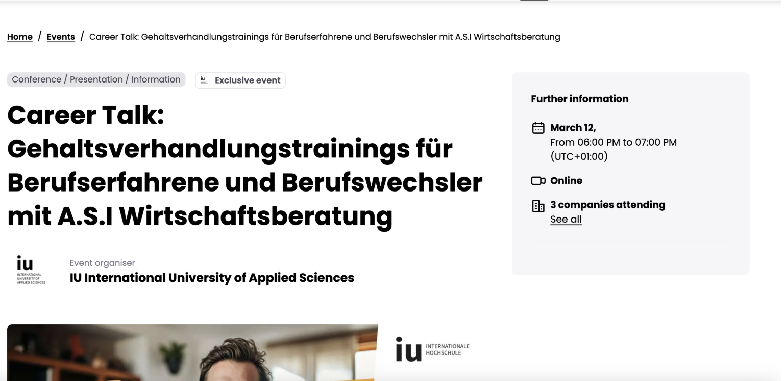 👉 Example: In the image below, we are logged into the "test CM" Career Center, but the event is exclusive to the "IU" Career Center. This is why there is no registration button.