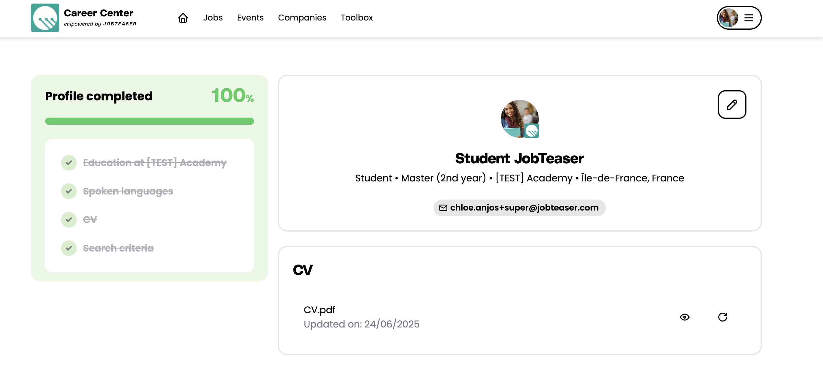 Your profile completion rate is an indicator that helps you check if you have fully customized your account. The more complete your profile is, the more you can take full advantage of JobTeaser’s features.