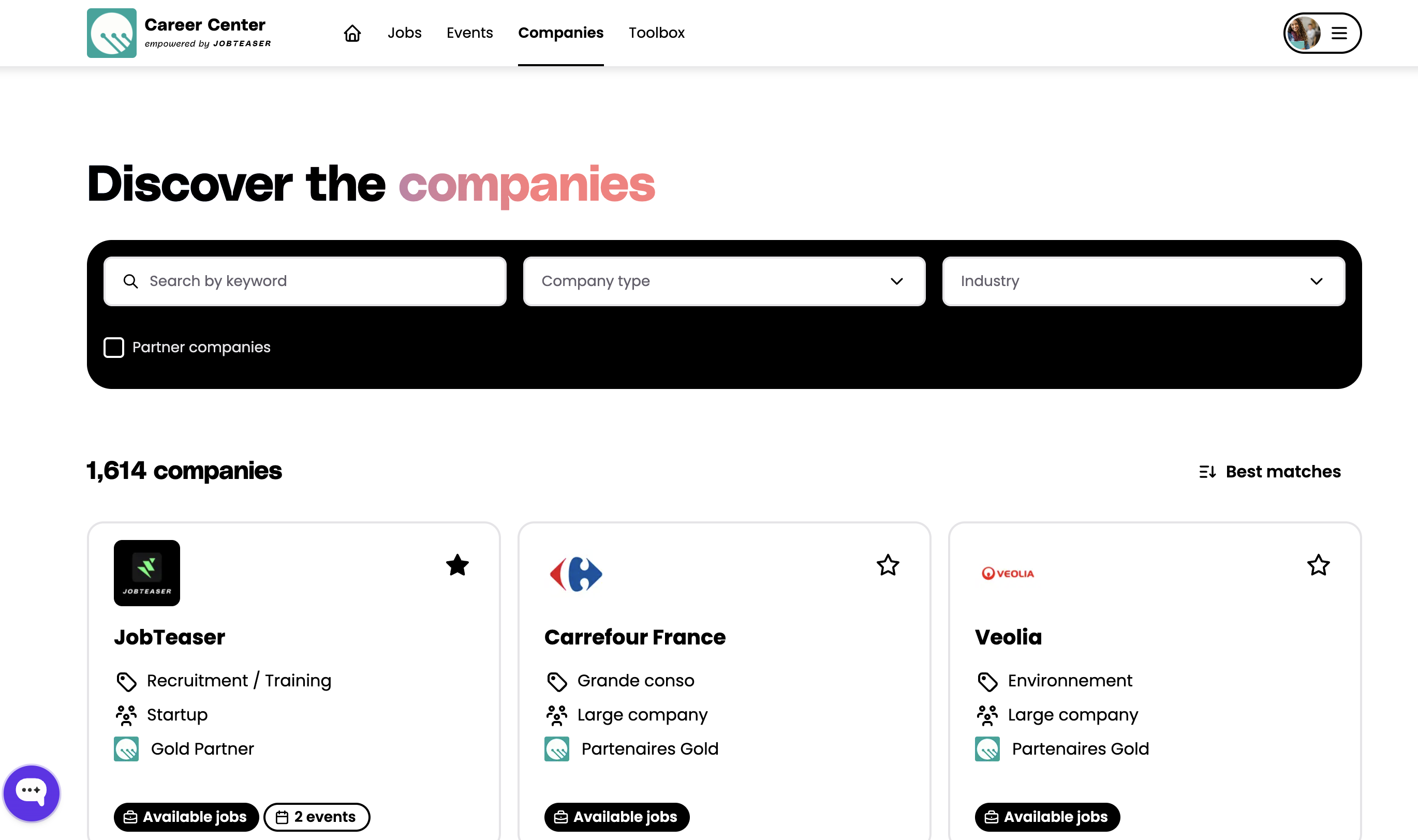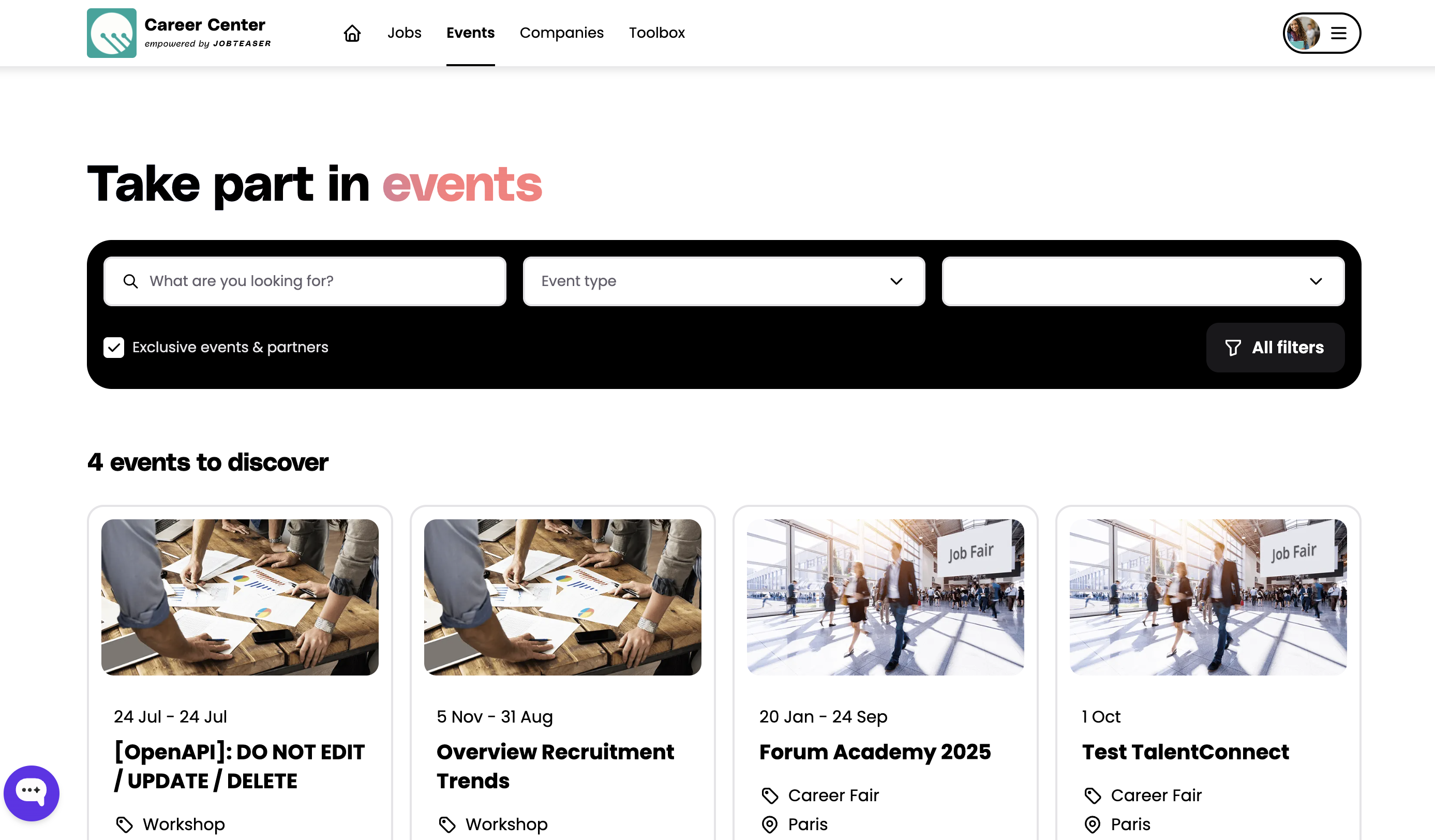 En este módulo, encontrará dos tipos de eventos: eventos públicos añadidos por JobTeaser y eventos exclusivos propuestos por su institución o sus empresas asociadas, es decir, empresas con las que su institución tiene una relación privilegiada.