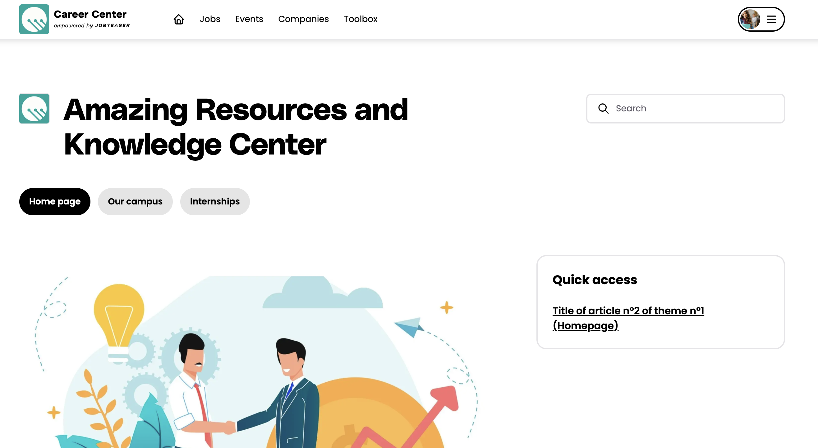 Si su institución utiliza el módulo del centro de conocimiento (este módulo puede tener un nombre diferente), aquí es donde puede encontrar toda la información que desea compartir con estudiantes y titulados. Todo el contenido de este módulo lo proporciona su centro. Encontrará artículos divididos en diferentes temas.