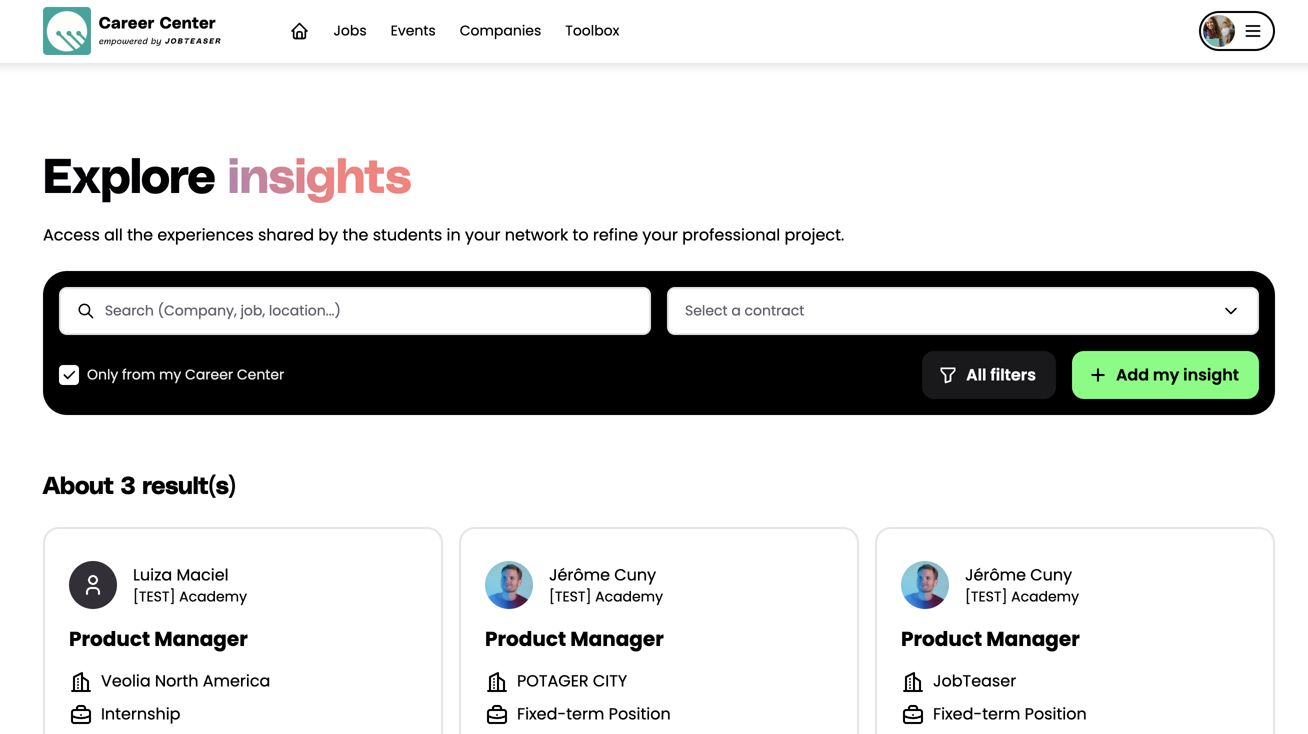 Consejo de 💡: no dude en desmarcar elfiltro «Solo de mi Career Center» en la parte izquierda de su pantalla para acceder a los comentarios de los estudiantes y titulados de otros centros y así proyectarte mejor en un puesto o en una empresa.