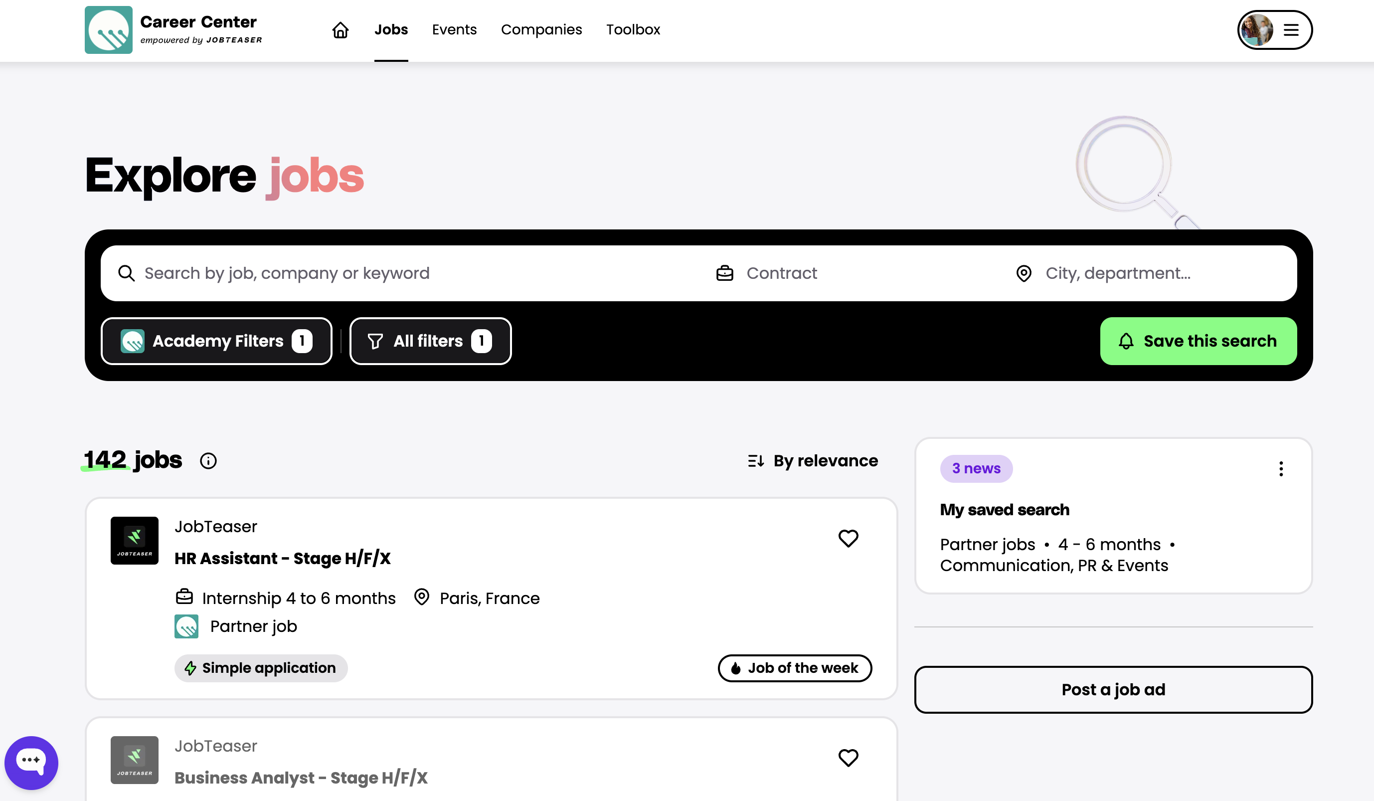 - Anuncios de empleo público, que se pueden encontrar en todos los Career Centers de las instituciones asociadas a JobTeaser.