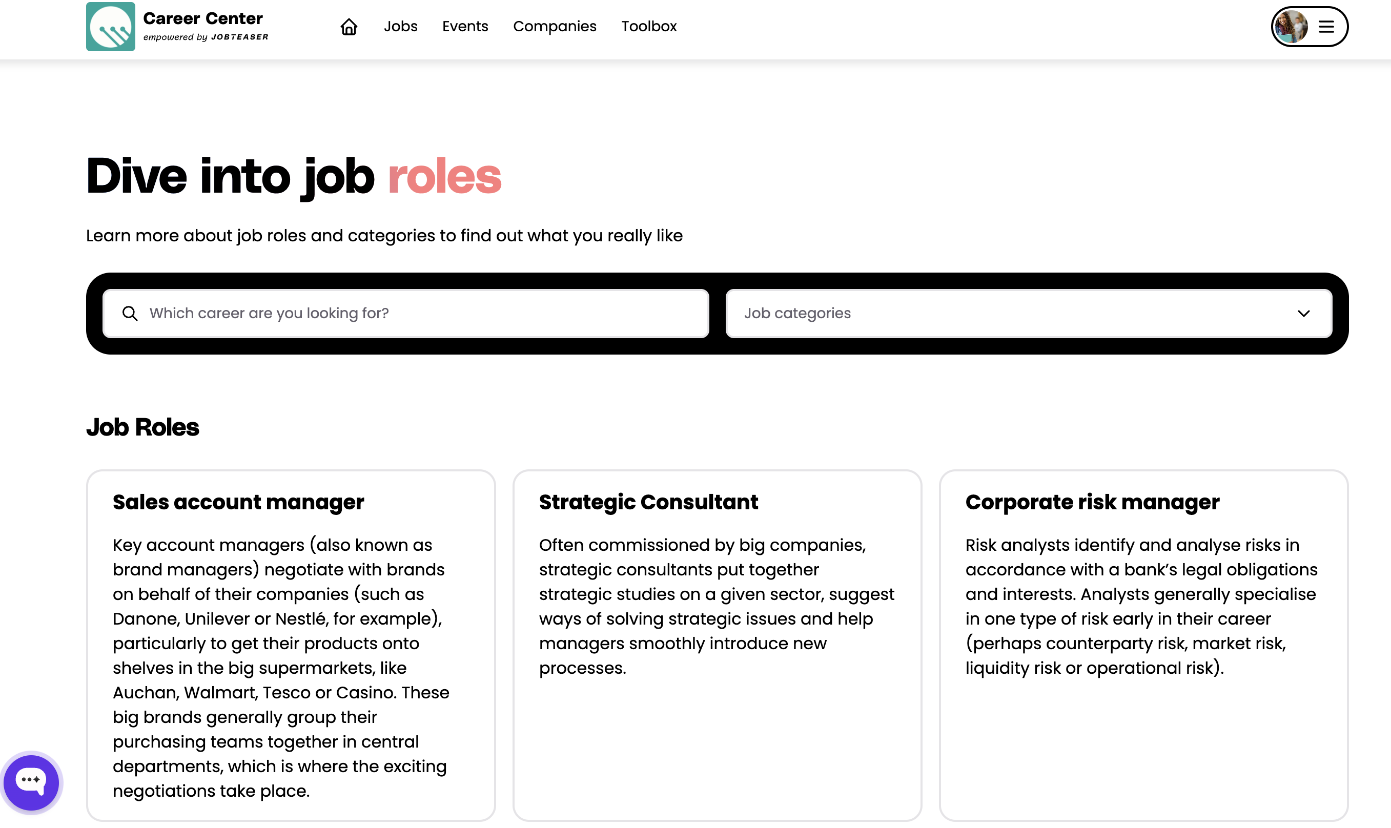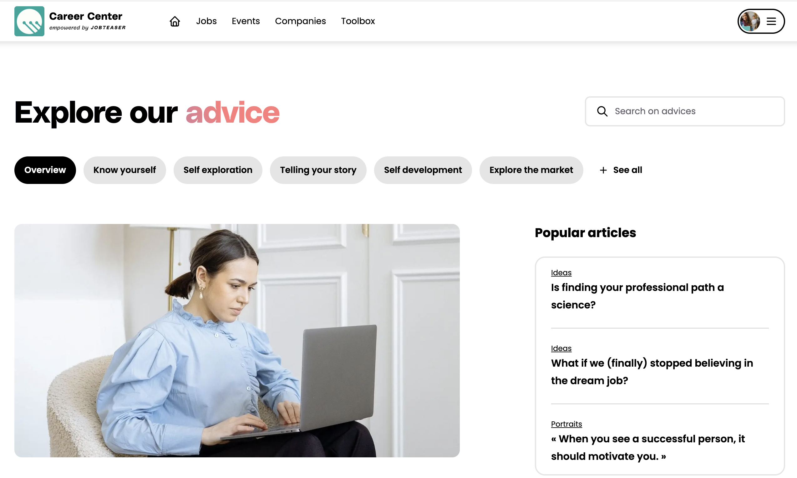 En el módulo de asesoramiento solo encontrará contenido ofrecido por JobTeaser. Este contenido puede ser artículos, vídeos o podcasts sobre varios temas relacionados con la gestión y la orientación profesional. El objetivo de este módulo es proporcionarle una base sólida de conocimientos sobre estos temas.