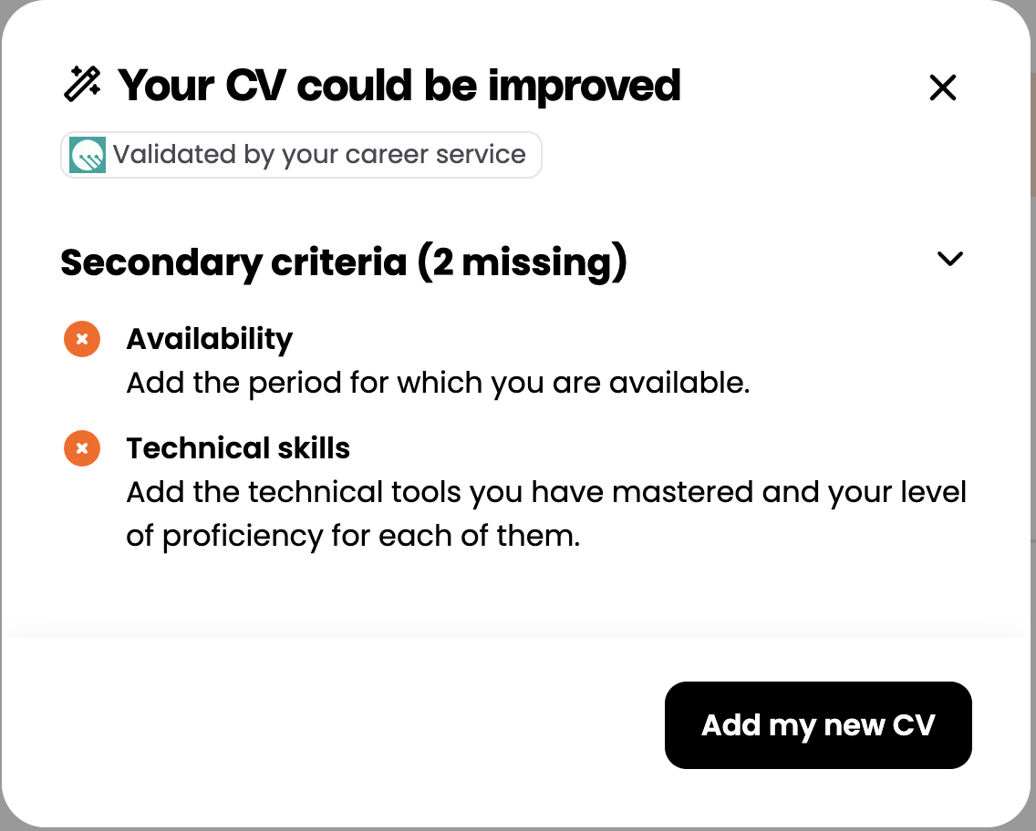⚠️ Certaines écoles n'ont pas activé l'option de vérification de CV dans leur Configuration. Vous pouvez vous renseigner auprès de vos conseillers carrière si vous n'êtes pas certain d'avoir accès à l'outil.